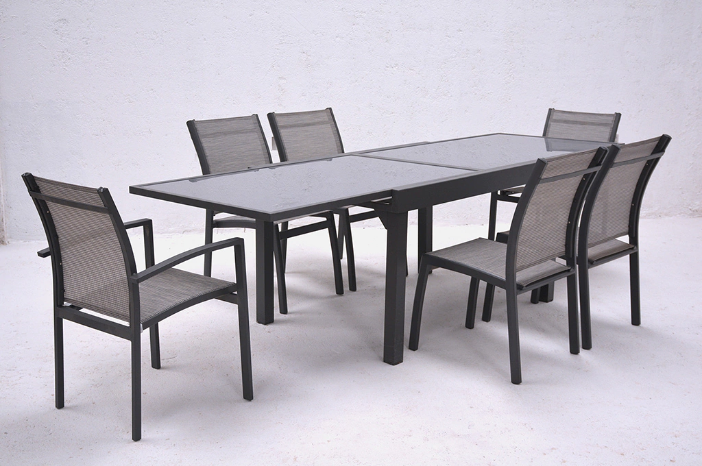 Mesa extensible de aluminio con vidrio templado.